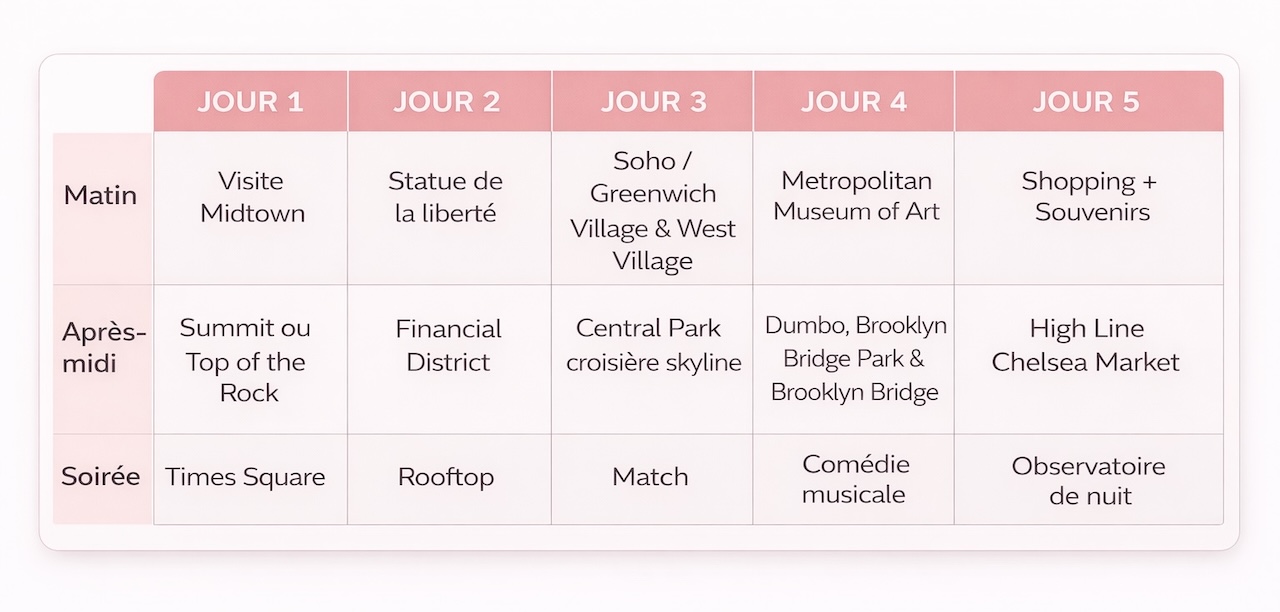 5 jours à New York, c’est sans doute l’un des formats les plus équilibrés pour découvrir la ville. Assez long pour voir les grands incontournables et assez confortable pour flâner un peu dans les quartiers et ressentir vraiment l’énergie de la ville. On peut aussi commencer à vraiment profiter des soirées new yorkaises sans trop souffrir du décalage horaire, surtout en fin de séjour. Pour les sensibles du jet-lag (comme moi !), n’hésitez pas à alléger au maximum la toute première soirée… Un burger à Times Square et au lit 🙂