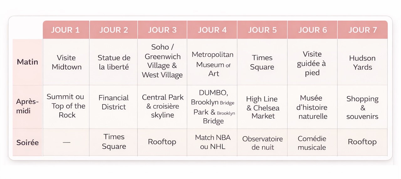 Avec une semaine sur place, on a le temps de voir les grands incontournables, mais aussi d’explorer les quartiers plus en profondeur et de s’offrir des expériences très différentes, entre musées, balades, sport et spectacles… On peut profiter de tout ce que New York a à offrir, du matin au soir ! En 7 jours, on peut aussi se permettre d’alléger au maximum la première soirée pour éviter les effets du jetlag. Si la fatigue est trop importante, mieux vaut se ressourcer et se reposer pour mieux attaquer les visites du lendemain !